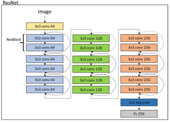 Two convolutional network architectures, called VGG [] and ResNet [], were selected for this analysis. The flowcharts of the specific VGG and ResNet architectures tested are shown in Figure 2 and Figure 3. In both architectures, ReLU operations were used as transfer functions. A detailed description of the two convolutional network architectures can be found in the above-mentioned references. We only wish to highlight that the two chosen architectures differ in depth (i.e., the number of layers) and in the number of convolutional layers (3 in VGG and 19 in ResNet). Moreover, ResNet is characterized by the use of “residual blocks”, where the input and output of a sequence of two convolutional layers are connected by a “shortcut connection” that has been shown to be very effective for training very deep networks, avoiding degradation issues due to the depth [].