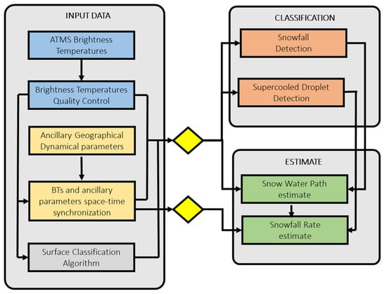 - The input data block, which includes the pre-processing of BTs and ancillary variables and the surface classification at the time of the overpass (self-standing module);