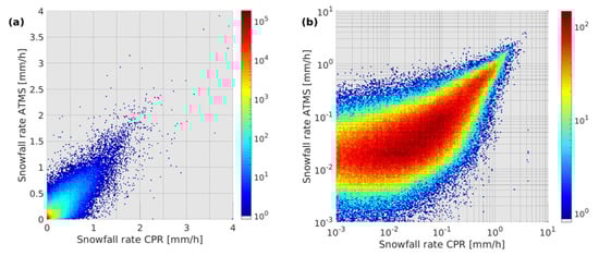 Comparison of SWP from CloudSat CPR and ATMS in test dataset. Both panels show density scatterplots, on linear (a) and logarithmic (b) scales.