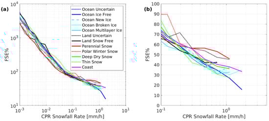 In this study, reference values for the snow water path (SWP) and snowfall rate estimate (SRE) were obtained from the CloudSat snow profile product (2C-SNOW-PROFILE v.05A; []). This product provides estimates of the vertical profile of falling snow, such as snowfall rate, snow water content, and parameters of the snow size distribution. These estimates were retrieved, using an optimal estimation method [], from the CloudSat CPR reflectivity profiles where snowfall was probable or certain (based on the classification of the 2C-PRECIP CPR product) and only for dry snow (i.e., a liquid water fraction less than 10–15%).