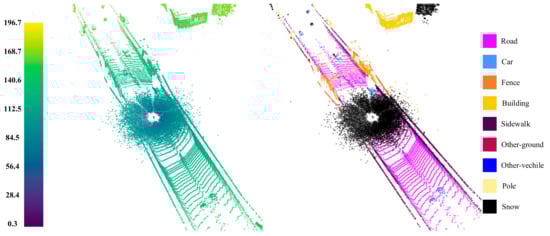 As seen from the development of the aforementioned datasets, the construction of datasets is moving toward all-weather data acquisition that covers different weather conditions and features fine point-wise data annotation. For snowy weather conditions, the DENSE dataset [] and the Canadian Adverse Driving Conditions (CADC) dataset [] were released successively in 2020. The DENSE dataset provides point cloud data with 3D annotated scans for rain, snow and fog and the CADC dataset provides point cloud data with 3D annotated scans for snowy weather; however, neither dataset provides fine point-wise annotation that allows for data analysis. The WADS dataset [], released in 2021, includes over 26 TB of multimodal data on snowy days and approximately 7 GB of point cloud data containing 19 sequence sets with point-wise semantic annotation. This dataset adopts the 20 semantic categories delineated in the SemanticKITTI dataset and includes two additional categories: falling snow and accumulated snow. Compared to other snow-containing LiDAR point cloud data, the fine point-wise annotation of individual snowflakes in the WADS dataset fully reflects the environmental details, which facilitates data characterization, as shown in Figure 1.