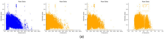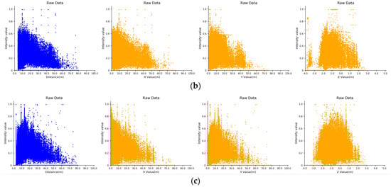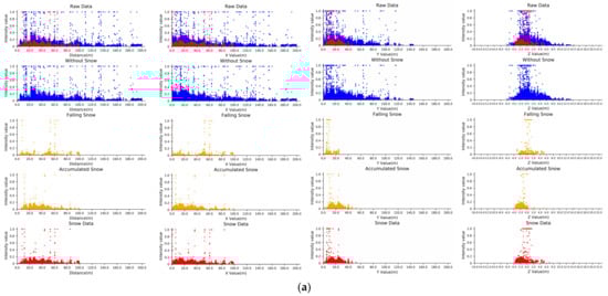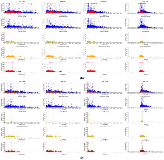 From the point of view of data acquisition, for each scan of the point cloud that is collected by the LiDAR, the data of any point can be expressed as , where represents the position coordinates of the point and denotes the intensity of the point; is introduced to indicate the distance of the point from the sensor center. Therefore, the sensing information could be divided into two independent parts: and ( is normalized). First, the 50th scan of sequences 11–13 was chosen to establish the correspondence between the and of snow noise points and non-snow points. The visualization is shown in Figure 2 and Figure 3. Figure 2 is composed of three subgraphs, which correspond to the statistics of the 50th scan of sequences 11–13 in turn. Each subgraph is the corresponding relationship between and from left to right. Among them, snow noise points are represented in red, non-snow points are represented in blue and falling snow and accumulated snow within snow noise points are represented in orange.