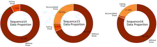 After this initial analysis of the correspondence between distance and intensity, we selected the 60th scans from sequences 14–16 for use in a statistical analysis of the data percentages and distributions. A visualization of the statistics in terms of the percentage of snow noise points vs. non-snow points is presented in Figure 4, which shows that it is difficult to analyze the specific magnitudes of the weights of snow noise points from the data percentage perspective with natural factors as a force majeure.