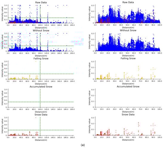 The Sensible 4 bus, a Finnish autonomous bus that recently underwent a public test in snowy conditions, is the latest achievement of research into the operation of autonomous vehicles in winter. Even human drivers are cautious when driving in snowy conditions, so there is no doubt that adverse weather conditions have delayed the development of autonomous driving technology and that snowy conditions pose a serious challenge to the implementation of this technology []. The challenges are manifold: first, snowflakes adhere to sensors, thereby inhibiting the detection of signals and reducing the detection range; second, snowflakes in their solid state tend to collect and form solid obstacles or are distributed in high densities around the sensors; third, snowflakes adhere to the surfaces of various environmental elements, such as vehicles, road signs and buildings, resulting in low intensity values being collected by the sensors; fourth, snowfall may cause snow to accumulate on the road, which may change the drivable area and affect the accuracy of route planning. From the perspective of environmental perception, the impact of snow on the acquisition of LiDAR data is intuitively reflected in the point cloud; hence, dealing with the snow noise in the point cloud is a key factor in determining the robustness and accuracy of environmental perception. Several representative LiDAR de-snowing methods have emerged that are based on the characteristics of snowflakes, including: the filtering method, which treats snow noise as outliers and is combined with statistical analysis to remove snow noise []; intensity filtering algorithms that remove snow noise based on its low intensity []; a dynamic radius filtering method designed to remove snow noise based on the characteristics of the LiDAR point cloud (the LiDAR point cloud is denser at closer distances, i.e., the number of points decreases as the distance increases) []; and the CNN-based de-snowing method (however, this method is limited by the dataset and thus, its generalization needs to be improved) []. Based on these research findings, we systematically analyzed the characteristics of LiDAR point cloud data under snowy conditions, clarified the distribution pattern of the point cloud and developed a dynamic filter that integrates distance and intensity. The experimental results from the WADS dataset [] fully demonstrate the effectiveness of our method. The main contributions of this study are described as follows: