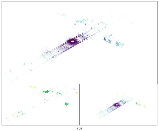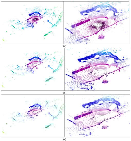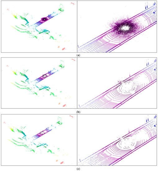Note that some snow noise points were retained because snow that is attached to the surfaces of certain environmental elements, such as vehicles, tends to produce noise points with high intensity values. Therefore, to better preserve the detailed features of the environment, we retained points whose intensity values were significantly higher than the threshold . Park et al. [] presented a similar discussion on intensity-based filtering with LIOR, as shown in Figure 6.