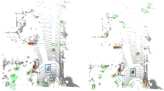 We selected Sparsely Embedded CONvolutional Detection (SECOND) [] for object detection, which was initially proposed in 2018. The comparison data were the 90th scan of sequence 34. The results are shown in Figure 9. The left-hand figure shows the object detection results on the raw scan and the right-hand figure shows the object detection results on the de-snowing scan. The object detection result was clearly improved after snow removal and noise reduction. Although there was a certain false positive rate, the vehicle close to the LiDAR could not be detected on the raw scan, but the vehicle could be accurately detected on the de-snowing scan (shown in the blue rectangular box).