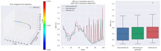 Subsequently, we choose the open-source SLAM algorithm called MULLS [], which was published on ICRA2021, as the benchmark to compare the pose estimation results on raw scans and de-snowing scans. We used three kinds of input data for the experiments: raw scans, the scans that filtered out snow noise points using our DDIOR (abbreviated as Desnowing) and the scans that filtered out snow noise points according to semantic ground truth (abbreviated as DesnowedGT). For the evaluation of the SLAM algorithm, the quantitative evaluation index of absolute pose error (APE) was applied using Sim (3) Umeyama alignment in the calculation. We then used the evo tool [] to evaluate the estimated pose results. Figure 10 shows the APE visualization results for the different inputs of sequence 24. It should be noted that each sequence in the WADS dataset only has about 100 scans. Due to the small amount of data, it had no significant impact on pose estimation, so we can only show the comparison results of the pose estimation of one sequence. Nevertheless, we can see that snow removal improves the overall pose estimation, which proves that our de-snowing algorithm is helpful for improving the environmental perception of autonomous vehicles.