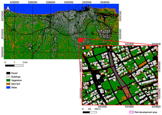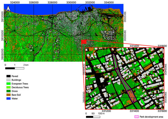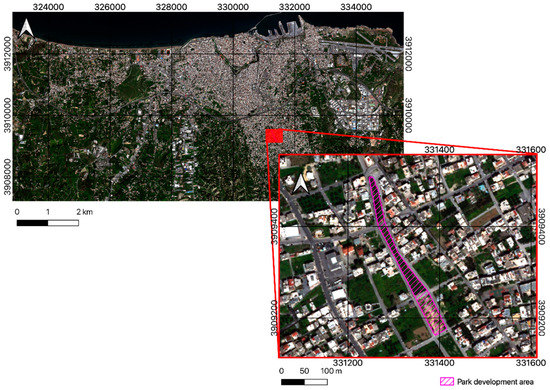 This study focuses on the development plan for a new recreation park in a residential area of the city of Heraklion, the largest city of the island of Crete, and the fourth largest in Greece, with a population of more than 200,000 inhabitants. The region’s climate is characterized as hot-summer Mediterranean, falling in to the Csa category in the Köppen climate classification scheme. The approximate area of the municipality of Heraklion is 244.6 km2 and it is divided in a number of urban units as presented in the Supplementary Materials (Figure S1). The Area of Interest (AOI) in this project is located in the district of Mesabelies, one of the southernmost and peri-urban areas of Heraklion, which is developing rapidly. The municipal development plan for this district includes the renovation of an area without any current use to a recreational park, which will include a bicycle lane, a pedestrian walking route, and children’s playgrounds. The intervention is labeled as a green space development, including tree and lower shrub plantations throughout the whole area. However, the respective development plan also includes the substitution of grass and bare soil with paved surfaces (bicycle and pedestrian lane). The first part of the development corresponds to a total area of approximately 1.5 hectares, about half of which are going to be part of the green space and are presented in Figure 1. The detailed development plan is presented in Section 2.3.1.
