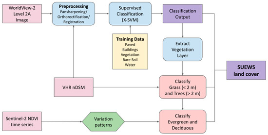 The workflow for producing the surface cover map using multi-source EO data is presented in Figure 2. WorldView-2 (WV2), very high spatial resolution imagery which was acquired on 19/03/2020 was used to produce the baseline surface cover map. WV2 imagery contains a panchromatic, at 0.5 m × 0.5 m, and 8 multispectral bands, at 2 m × 2 m (Table S1). The processing of this product includes radiometric and sensor-related corrections, providing a Circular Error (CE90) ranging from 5 m to 23 m. As shown in Table 3, SUEWS input requirements include 3 vegetation classes, namely Grass, Evergreen Trees, and Deciduous Trees. Extracting these solely from WV2 imagery is not possible due to vegetation spectral similarity in the available bands. In order to overcome this issue, we exploit a high resolution normalized DSM (nDSM, Figure S2) to discriminate between grass and trees, as well as time series of Sentinel-2 imagery (20 × 20 m, Table S2) downscaled to 10 × 10 m [36] to categorize trees as evergreen and deciduous.