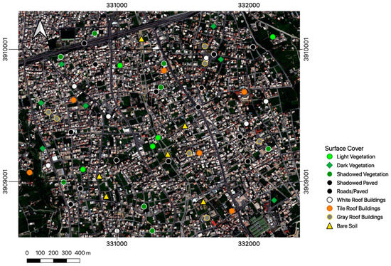 Following, to map the surface cover, the final orthorectified product was classified, using also the Normalized Difference Vegetation Index (NDVI), extracted from WV2 red and near infrared bands (Table S1) as an extra spectral band. A recent extension of the traditional support vector classifier (SVM), namely X-SVM [42] was used. The X-SVM classifier reduces the need for manual parameterization of the classification process, assisting the user to reach optimum results much faster. To produce the surface cover map, 9 classes are originally selected and a minimum number of 50 training points for each class is acquired from the original WV2 image. Some classes are merged, after the classification of the image is executed. This approach is standard when working with classes which are not inherently separable from the spectral signatures of the objects in the image, i.e., buildings which may include roofs with tile, cement or insulation material. Indicative locations of the respective sampling points in the vicinity of the urban intervention are shown in Figure 3.
