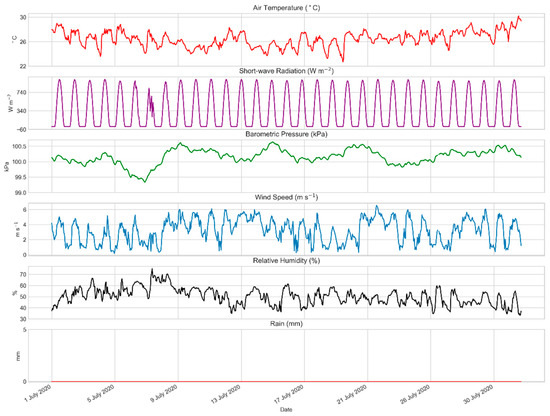 The minimum meteorological and radiation input requirements of the USM (see Model requirements) were provided by the HECKOR flux tower [45], which is located close to the study area. Focusing on heat stress, the model ran for June and July of 2020. HECKOR observations for July are shown in Figure 4, whereas June was used as a spin-up period for the model, which essentially secures that the initial conditions, such as soil moisture, are based on model computations. Generally, Figure 4 indicates a typical dry summer month with overall high temperatures.
