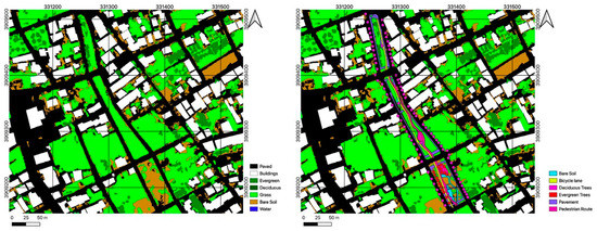 This study aims at quantitatively analyzing the potential effects from the renovation of a new park in a residential area of Heraklion, and the surface cover changes modeled in this study are based on the development plan, as provided by the Heraklion Municipal Authorities (Municipality of Heraklion 2021; personal communication). Therefore, the baseline model run simulated the current situation of the study area, whilst a second run simulated the scheduled surface cover changes as depicted in the surface cover maps shown in Figure 5. As mentioned earlier, the imminent changes include the plantation of several trees in the perimeter of the park, and the substitution of bare soil/vegetated surfaces with pavements which will serve as pedestrian routes and bicycle lanes. The model ran by using a grid configuration with 100 m × 100 m cells covering the urban intervention area, as well as the surrounding building blocks (Figure 6). The model outcomes for each grid cell were analyzed on the basis of the corresponding surface cover change.
