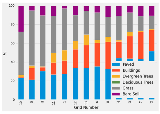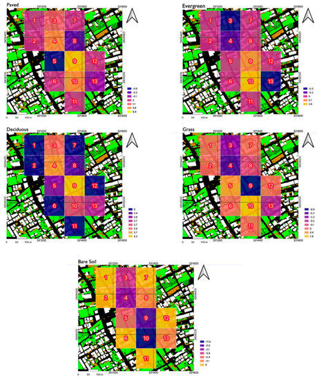 Paved cover shows a general increase in most grid cells, with a maximum increase of 8.9% for grid cell 9, as a result of the bicycle and pedestrian lane development. Evergreen trees do not show significant changes, with the exception of grid cell 10 with an increase of 2.6% in this class, due to the plantation of olive trees in this region of the park. The development plan includes the plantation of deciduous trees across the whole area of the park, hence this class percentage increases for all grids, with a maximum of 4.3% for grid cell 9. Grass is the dominant land cover class of the area prior to the development, and it is mainly substituted with paved and tree cover, showing an overall decrease across all grids, with the exception of grid cell 10 which shows an increase of 2.8%. Likewise, bare soil is mainly substituted with paved cover, trees, and grass, showing decreasing trends in all grid cells, with a maximum of −11.9%.