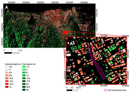 To extract the building and tree heights, we conduct a simple masking process using the buildings, evergreen trees, and deciduous trees’ layers from the finalized classified image, and the nDSM available superimposition of the buildings and the nDSM raster are presented in Figure S5. The masking process resulted in two raster-type maps with height information for each of the abovementioned layers, which are in turn used to compute the morphometric parameters required by SUEWS by employing a morphometric calculator included in the Urban Multi-scale Environmental Predictor (UMEP) [44].