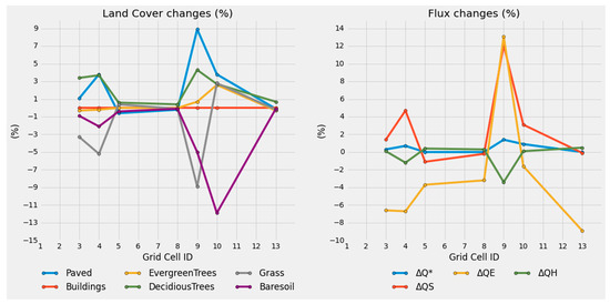 Grid cell 5 shows minimal changes in surface cover, as only a very small proportion of the development area falls within the grid area. However, the change in fluxes is in line with the changes in surface cover and the results of the rest of the grid cells. A decrease of paved surfaces leads to a decrease in ΔQS peaking at midday. This, in conjunction with the pattern of QE, causes QH to obtain an increase, which becomes lower over time. The same can be concluded for cell 8, where the maximum surface cover change is observed for deciduous trees with an increase of 0.4%, while paved, grass and bare soil cover decreases. It is easily observed that the differences in values presented in Table 6 fall within the margins of error shown in Table 5 for cell 8 and 13. As expected, the flux difference trends are very similar to those of cell 5.