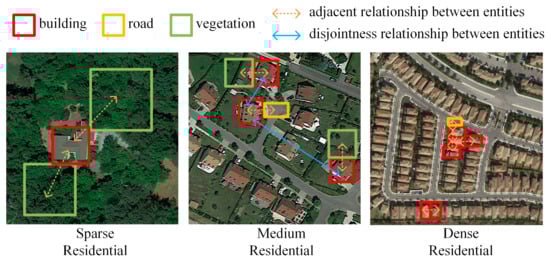 Remote sensing (RS) image scene classification is an active research area essential for image understanding at the scene level [1]. RS image scene classification focuses on categorizing images using semantic information. The task of RS image scene classification aims to discriminate images of various categories in an image dataset, giving one label to each scene image [1]. Scene classification is different from image segmentation or object-oriented classification, giving one label to each pixel or object. The spatial and topological relationships imbedded in RS images are invariant to image transformation, such as panning, distortion, or rotation, and are valuable for discriminating various categories of RS scenes. The adjacency and the disjointness relationships between objects are two types of commonly used spatial and topological dependency [2]. Some RS scene images contain the same type of geographical entities but have various spatial distributions among these entities and thus have different scene semantic labels. As shown in Figure 1, sparse residential, medium residential, and dense residential scenes consist of buildings, roads, and vegetation but have various adjacency or disjointness relationships among the entities.