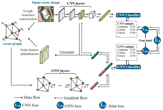 GNNs are usually combined with CNNs to perform RS image scene classification to make use of the strength of both on feature representation. One strategy of combining CNNs and GCNs is to treat CNNs as the feature extractor for the nodes of graphs, taking advantage of the outstanding visual feature representation ability of CNNs. Li et al. [24] used feature maps generated from a pretrained CNN model to initialize node features for scene graphs and then performed graph classification for these graphs with a trained GNN model. For this strategy, the representation quality of node features extracted by the pretrained CNN has a substantial impact on the performance of graph classification. Furthermore, some RS image scenes, such as deserts and oceans, may have inaccurate constructed scene graphs due to the lack of salient regions and obvious topological dependencies and, thus, it is difficult for them to effectively perform scene classification. It is difficult for this strategy to achieve promising RS image scene classification for these scenes of RS images.