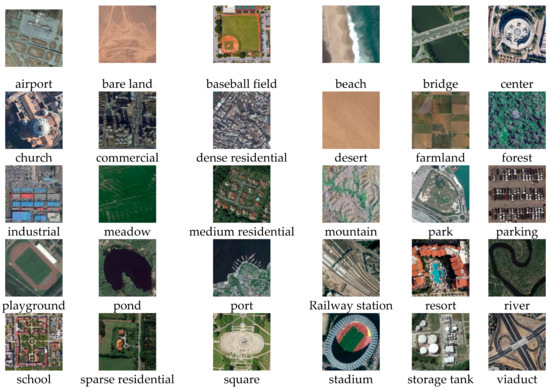 - Xia, G.S.; Hu, J.; Hu, F.; Shi, B.; Bai, X.; Zhong, Y.; Zhang, L.; Lu, X. AID: A benchmark data set for performance evaluation of aerial scene classification. IEEE Trans. Geosci. Remote Sens. 2017, 55, 3965–3981. [Google Scholar] [CrossRef] [Green Version]