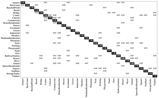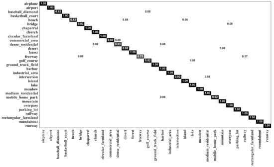 The confusion matrix generated by MopNet-GAT-ResNet50 on the OPTIMAL-31 dataset is presented in Figure 6. It can be seen that 28 out of 31 categories had scores higher than 90%, with 21 categories having scores of 100%. MopNet-GAT-ResNet50 had a better ability to discriminate the classes that are easily misclassified by other methods, such as DM-GAF [23]. The commercial area, dense residential area, and industrial area were classified by our model with accuracies of 92%, 83%, and 100%, respectively, while these three classes only obtained accuracies of 83%, 67%, and 83%, respectively, by DM-GAF [23].