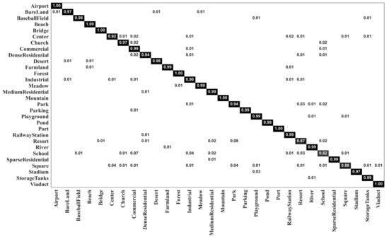 Figure 7 and Figure 8 show the confusion matrixes generated by our MopNet-GCN-ResNet50 on the AID dataset under training ratios of 20% and 50%, respectively. The number of categories with classification accuracies higher than 95% was 22 and 24 under the training ratios of 20% and 50%, respectively. The most obvious misclassification occurred between the categories of resort and park, and between the categories of school and commercial area. Taking the results under the training ratio of 20% as an example, 4% of the images from the resort were misclassified as parks, and 3% of the images from the school were misclassified as commercial. Similar confusion also occurred for IDCCP [46] and the method combining GCN with CNN [32]. Nevertheless, our MopNet performed better in classifying these confusable categories than these two methods. Specifically, for IDCCP [46], 16% of images from the resort were classified as parks, and 6% of images from the school were classified as commercial. For the method combining a GCN with a CNN [32], 6% of the images from the resort were classified as parks, and 3% of the images from the school were classified as commercial.