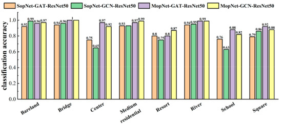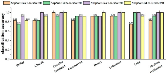 As seen in Table 6, for the AID dataset, the commercial, dense residential, and industrial categories had abundant details in the scene images and thus had a large number of graph nodes. For these categories, our MopNet obtained accuracies of 98%, 97%, and 95%, respectively, under the training ratio of 20%, while the results generated by the method combining GCN with CNN [32] were 95%, 91%, and 94%, respectively. In contrast, categories such as desert and meadow had poor textures and thus had the fewest graph nodes. Our MopNet obtained accuracies of 97% and 99% separately for these two categories, while the method in [32] obtained accuracies of 92% and 98%, respectively.