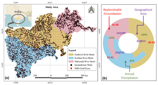 Study area specifications. (a) Godavari, Krishna, and Mahanadi river basins (GRB, KRB, and MRB, respectively) selected for the current study. The grid points corresponding to the IMD (India Meteorological Department) gridded precipitation data and the groundwater well locations are also shown by filled red diamonds and filled black circles, respectively. (b) Basin-wide estimates of total replenishable groundwater resources (km3), geographical area (km2), and annual precipitation (mm) from January 1980 to December 2014. Further specifications of the study basins are listed in Section 2.1.