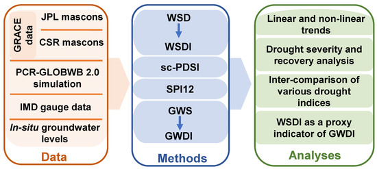 Three river basins, namely, the Godavari, Krishna, and Mahanadi river basins (abbreviated as GRB, KRB, and MRB, respectively), were selected for the study (Figure 1, Table 1). Compared to the national mean annual rainfall (1200 mm), these basins receive a limited amount (for the GRB and KRB) or a fair amount (for the MRB) of rainfall, of which 80 to 90% occurs during the monsoon season (June–September). The dependency of water supply on the groundwater in all three basins is more than 70%, which is likely to be increased in the future due to the continuously rising groundwater consumption [32,33]. Moreover, inadequate public water supply systems and advanced pumping and drilling technologies may further intensify the unsustainable groundwater extraction, often through unregistered wells, in the area. A summary of various salient features of the study basins is shown in Table 1 and a schematic of the methodology and various research components of this study is shown in Figure 2.