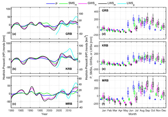 Nonlinear trends and seasonal variability. (a–c) Nonlinear (Hodrick–Prescott) trends in the anomaly time series of precipitation (P), modeled soil moisture storage (), modeled groundwater storage (), and modeled land water storage () from January 1980 to December 2014 and GRACE-derived LWS () from April 2002 to December 2014 for GRB (a), KRB (b), and MRB (c). (d–f) Box-whisker plots of P, , , and anomalies in GRB (d), KRB (e), and MRB (f) from January 1980 to December 2014. The values of all the variables are shown in equivalent water depth (mm). The horizontal lines within the boxes represent the median value, the extent of the box signifies the 25th–75th percentile (inter-quartile) range of the respective data, and the lower and upper whisker limits represent the ±1 standard deviation of the individual time series.