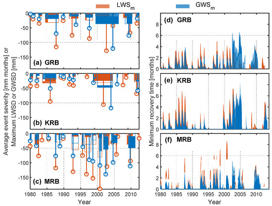 Comparison of drought severity and recovery time in and . (a–c) Average event severity for the drought (deficit) events identified in and for GRB (a), KRB (b), and MRB (c) from January 1980 to December 2014. Maximum deficits (LWSD) and deficits (GWSD) are also shown by the stem plots. (d–f) Minimum recovery time corresponding to the monthly deficits (both LWSD and GWSD) during the study period.