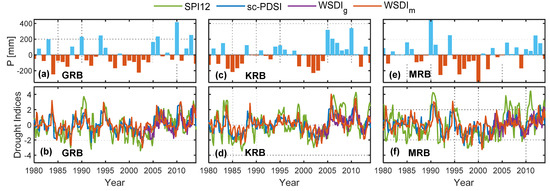Comparison of WSDI with traditional drought indices. Anomaly time series of precipitation and various drought indices (sc-PDSI, SPI12, , and for GRB (a,b), KRB (c,d), and MRB (e,f), respectively).