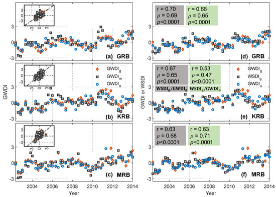 Comparison of various GWDIs. (a–c) Groundwater drought indices derived from GRACE-based GWSA (), from -based GWSA ( ), and calculated using the in situ well data ( ) for the GRB (a), KRB (b), and MRB (c) from May 2002 to January 2014. The GWDI time series are denoted four times a year (January, May, August, and November) when the observed GWS records are available. Scatter plots of and with for all three river basins are also shown in the insets. The 1:1 lines are also shown with dashed black lines. (d–f) Comparison of with and for the GRB (d), KRB (e), and MRB (f). Pearson correlation coefficient (r), Spearman rho ( ), and p-values for and (grey boxes), and and (light green boxes) are also shown for the three river basins.