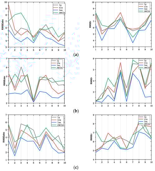 We used the root-mean-square error (RMSE) of sphere center coordinate parameter estimation () and sphere radius parameter estimation () as the evaluation metrics to compare differences among LS, TLS, and the RWTLS algorithms. The two evaluation metrics are expressed as follows:
