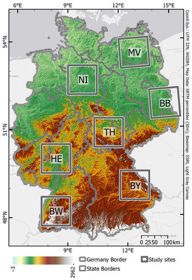 Seven study sites across Germany in the shape of Sentinel-2 tiles (109.8 km × 109.8 km) were chosen based on the reference data availability, the reference data quantity, the distance between study sites, and their regional dissimilarities (Figure 1). The acronyms of the study sites correspond to the second part of the ISO 3166-2 codes of the German federal states where the study sites are mainly located. (Here, BW-Baden-Württemberg, BY–Bavaria, BB–Brandenburg, HE–Hesse, MV–Mecklenburg-Western Pomerania, NI-Lower Saxony, TH–Thuringia). Three sites are located in the Northern German Lowlands (MV, BB, NI), one site in the Central Uplands (TH), two sites in the South German Scarplands (BW, HE), and another one in the Alpine Foreland (BY). The elevation gradually increases from the German Lowlands in the north to the Alps in the country’s south. Furthermore, we will use the codes of the German federal states to refer to the specific study site.