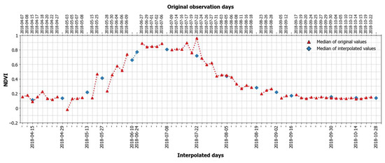 The remote-sensing data acquired for seven study sites are located in different orbit tracks, resulting in variation of data acquisition times across sites. In the case of optical data, clouds and cloud shadows reduce the consistency of the time-series. To generate evenly distributed dense time-series features for all study sites, we first generated bi-weekly datetime arrays from the 1 October 2017 to the 31 October 2018. The resulting 29 time-steps were used as the anchor dates to which we interpolated nearest (on time dimension) observation values from optical data (Figure 3). For SAR data, we selected images recorded seven days before and six days after the anchor date and calculated the median of these images at the pixel level. Generation of dense time-series features was performed for all optical and SAR variables described in Section 2.3.