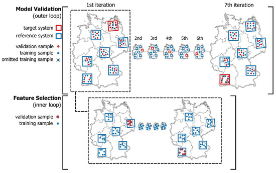 The study design was structured in the typical nested cross-validation manner where an outer loop is used for accuracy estimation using a spatially independent test-set while an inner loop is used for tuning the models via spatial feature selection (Figure 4). The training data distribution across Germany partially reflects the existing studies [2,3] where dense reference data is available for large areas but completely missing over other large areas, for example, entire federal states. In future studies, the permutation of not all study sites but all possible combinations (site-to-site transfer, 2 × 2 split) could be considered to better understand and maybe compensate for the reasons for accuracy losses in transfer regions.
