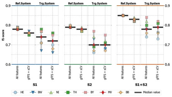 We call the accuracy scores received from the reference system test-set samples ‘reference system accuracy’. The accuracy scores received from the target system test-set samples we call ‘target system accuracy’. The average and class-specific F1-scores (F1) were used as accuracy measures (Equation (4)). To better assess the quality of the model transfer to the target systems, we calculated the ‘accuracy loss’ (F1loss) by subtracting the F1-score acquired from the reference system from the F1-score acquired from the target systems (Equation (5)).