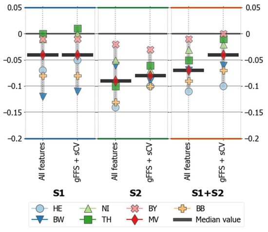 The spatial transfer experiments based on S1 features showed higher accuracy values than those based on only S2 features (Figure 6). The lower accuracy losses in models based on S1 features and S1 + S2 were received compared to those based on S2 (Figure 7). The median F1-score loss with S1 features is −0.04. For S2 features, it equals −0.08, and for the combination of two sensors, it is −0.06. In the experiments with S1 + S2, performing spatial feature selection helped to reduce the average accuracy loss to 0.04 across the seven target systems.