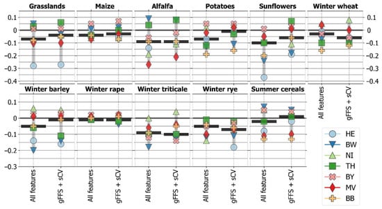 As in the reference systems, the average accuracy values in the target systems were the highest when we combined optical and SAR features (see Supplementary Material C). The potato and winter rape classes have shown equally high median accuracies with only S1 features as with features combinations (S1 + S2). In target systems, the average accuracy dropped for all classes except for winter rape when compared with the reference systems (Figure 9). For alfalfa, sunflowers, and winter triticale, the accuracy losses were most significant. The maximum F1-score losses for these three classes reached the following: −0.27 for alfalfa (target tile MV); −0.38 for sunflowers (target tile HE); −0.28 for winter triticale (target tile BW). Moreover, increased confusion among winter cereals and between alfalfa and grasslands was observed with ‘gFFS+sCV’.