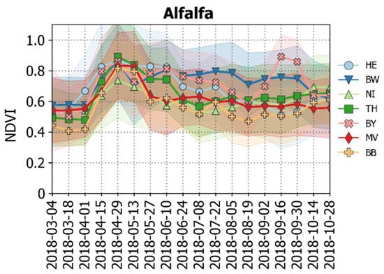 NDVI temporal profile of class alfalfa across seven study sites.
