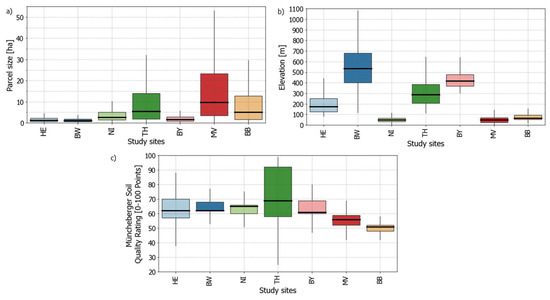 Distribution of (a) parcel sizes, (b) surface elevation, and (c) Müncheberger soil quality values among the seven study sites. Each boxplot contains all sampled 5500 points.