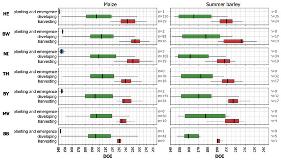 The temporal shifts in the timing of phenophases or field management activities (e.g., harvest) across the seven study sites can be observed from the phenological observation data acquired from DWD (Figure 13). For example, the average harvesting time for maize in tile BB happened approximately 3.5 days (minimum difference with tile MV) and 23 days (maximum difference with tile BW) earlier (Figure 13). When the Random Forest model was spatially transferred to tile BB, we obtained high accuracy losses for the maize class (see Figure 9). The same is true for summer barley, which is part of the summer cereals class (Figure 13). For winter wheat, notable temporal shifts (variation of median values: 27 days) were present in crop sowing events; For winter barley, higher dissimilarities were present in harvest time (17 days) than in the average timing of sowing events (8 days). The accuracy losses were higher for winter barley, with more temporal dissimilarities in harvest occurrence than for winter wheat (Figure 9). However, accuracy losses in the winter rape class were minimal despite similar differences in average harvest (14 days) and sowing (10 days) days across seven regions. More information is available in Supplementary Material G.