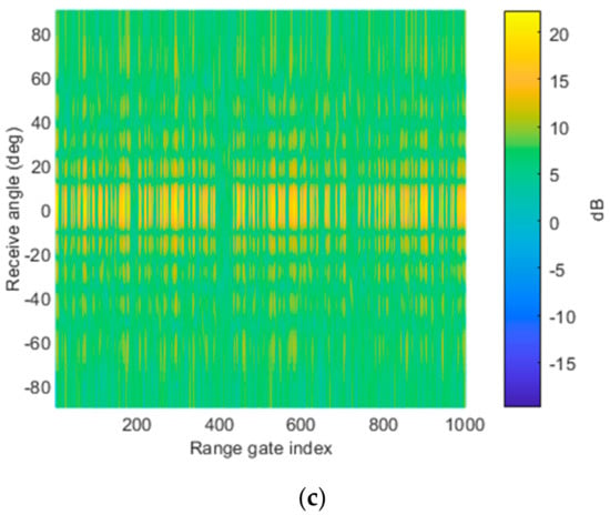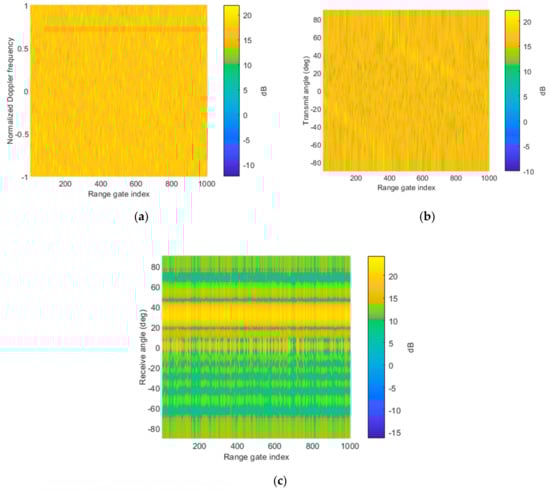 The properties of the receive signals, Figure 4. The Fourier power spectrum is calculated in this example. As aforementioned, the four-dimension data cube, i.e., receive–transmit Doppler range dimension, is obtained after multi-waveform separation. It is known that the suppressive jamming is approximately white, distributed in normalized Doppler frequency and range dimensions, which can be seen from the Fourier power spectrum in Figure 4a. The RGPO false targets are buried in the suppressive jamming because the deceptive jamming has lower power than the suppressive jamming. It is seen from the power spectrum in the receive spatial angle and range dimensions Figure 4c that the suppressive jamming is focused at an angle of 30 degrees, while the RGPO false targets are from 0 degree. Besides, it is seen that the RGPO false targets are randomly distributed in range dimension. In this simulation, we assume that the 200 RGPO false targets are randomly distributed within the subsequent PRI. From the power spectrum in transmit spatial angle and range dimensions Figure 4b, it is also indistinctly seen that the distribution of the false targets is the transmit angle and range-dependent. In order to clearly show the properties of RGPO false targets, the Fourier power spectrum of the received signal without the suppressive jamming is provided in Figure 5, as a comparison. It is seen from Figure 5a that the that RGPO false target are also randomly positioned in range and Doppler dimensions. Due to the introduction of frequency diversity, the distribution of false targets in the range and transmit angle dimensions are coupled, which can be obviously observed from Figure 5b. However, these false targets are focused in degree 0 of the receive dimension, as shown in Figure 5c.