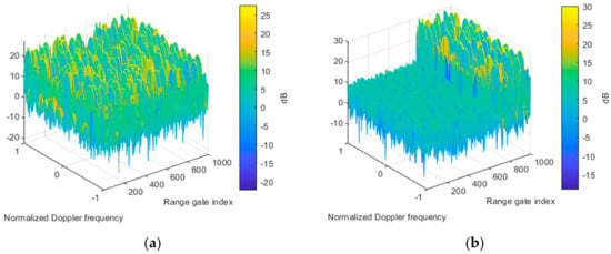 The RGPO can be suppressed with the two-dimensional transmit–receive beamforming in the adaptive and non-adaptive sense. In this subsection, we testify to the performance of the RGPO mainlobe jamming suppression. Here, we define the ratio of the frequency increment to PRF as . It is demonstrated that the ratio should not be an integer for effective jamming suppression []. The output signal-to-jamming-plus-noise ratio (SJNR) is calculated, with respect to different delayed pulses and ratios of frequency increments to PRF, as presented in Figure 11. The performance of non-adaptive beamforming is plotted in Figure 11a, and the performance of adaptive beamforming is plotted in FI It is seen that the jamming suppression performance degrades dramatically for some frequency increments and delayed pulses. For example, when the delayed pulse number is 10, the same as the transmit element number, it is impossible to suppress the mainlobe RGPO false target whenever choosing the frequency increment. When the delayed pulse number is 1, all these testified frequency increment are feasible for suppression of RGPO false targets. Moreover, it can be seen that the performance of non-adaptive beamforming might degrade, due to mismatches. Therefore, the parameter should be designed to obtain better RGPO jamming suppression performance.