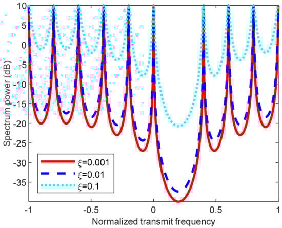 where is the expectation operator. The estimated covariance matrix might be contaminated by the true target, if the data under test is included. Besides, the covariance matrix might be under-determined because the RGPO false targets are discretely and randomly distributed in the range dimension. Some specific methods are proposed to improve the estimation accuracy of the covariance matrix []. Nevertheless, as the transmit spatial frequency of the power spectrum of the true and false targets in the joint transmit–receive spatial frequency domain are dependent on the frequency increment. By properly choosing the system parameters, the position of false target can be predicted, providing the angle parameter. In this case, the covariance matrix is constructed as: