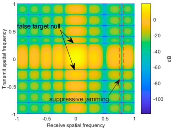As aforementioned, the transmit–receive beamforming can be designed adaptively or non-adaptively. Figure 9 plots the equivalent Capon power spectrum of the constructed covariance matrix in the transmit dimension. Notice that the performance of non-adaptive beamforming depends on the system parameters, array calibration error, and received signals. Generally, the RGPO false targets are delayed, with no more than four pulses in practice. Nevertheless, we designed many nulls of the beampattern to guarantee jamming suppression performance. Moreover, the uncertainty set associated with each null is used to widen the nulls for robustness. In this example, the uncertainty set is defined as , where is a ratio factor that controls the uncertainty set size. It is seen that a large uncertainty set results in the spread of power spectrum Figure 10 shows the two-dimensional transmit–receive adaptive beampattern. It is seen that the null of the beampattern is aligned to the suppressive jamming and RGPO false targets. Thus, the jamming suppression performance can be maintained.