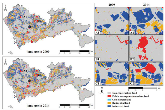 Urban land use data of Shenzhen in 2009 and 2014. Where (A–C) represent their respective regions, respectively; (A1,A2) represent the urban land use of region A in 2009 and 2014; (B1,B2) represent the urban land use of region B in 2009 and 2014; (C1,C2) represent the urban land use of region C in 2009 and 2014.