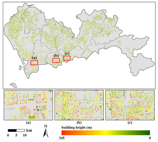 Spatial distribution of building heights in Shenzhen. (a) The central region of Nanshan District; (b) The central region of Futian District; (c) The southwestern region of Luohu District.