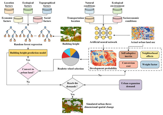 A flowchart of the proposed urban 3D spatial expansion simulation model is shown in Figure 6. This model contains two main parts: (1) one part based on the future land use simulation (FLUS) model to simulate urban land use changes in the horizontal direction, and (2) another part based on the RF regression to predict building height growth in the vertical direction. To simulate how to synergize the horizontal expansion and vertical growth, this model determines whether it is a new urban land use based on land use type after roulette selection and then predicts the building heights of urban land use.