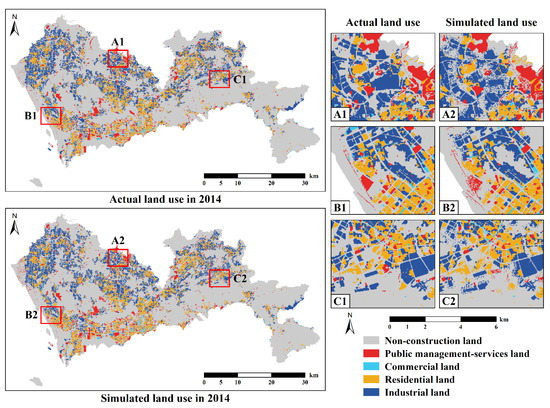 Actual and simulated land use patterns in Shenzhen in 2014. Where (A–C) represent their respective regions, respectively; (A1,A2) represent the actual and simulated land use patterns in region A; (B1,B2) represent the actual and simulated land use patterns in region B; (C1,C2) represent the actual and simulated land use patterns in region C.