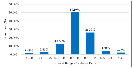 The results of building height prediction accuracy showed that R2 was 0.8628, RMSE was 2.0180, MAE was 1.3707, and EV was 0.8632. Therefore, the RF regression fits well and can explain the FAR of buildings well. To further evaluate the accuracy results and analyze the differences between the actual and predicted FAR, we predicted the FAR of all units in the study area. The spatial distribution of relative errors between predicted and actual FARs is shown in Figure 9. Overall, a correlation was between the relative error and actual FAR. The higher the actual FAR, the higher the relative error. The Nanshan, Futian, and Luohu Districts are extremely economically developed and contain many high-rise buildings. The higher the actual FAR, the more likely the forecast will be underestimated. As shown in Figure 10, the overall relative error in Shenzhen is low. A total of 50.19% of the units were in the range from −0.5 to 0.5, and 89.18% of the units were in the range from −1.75 to 1.75.